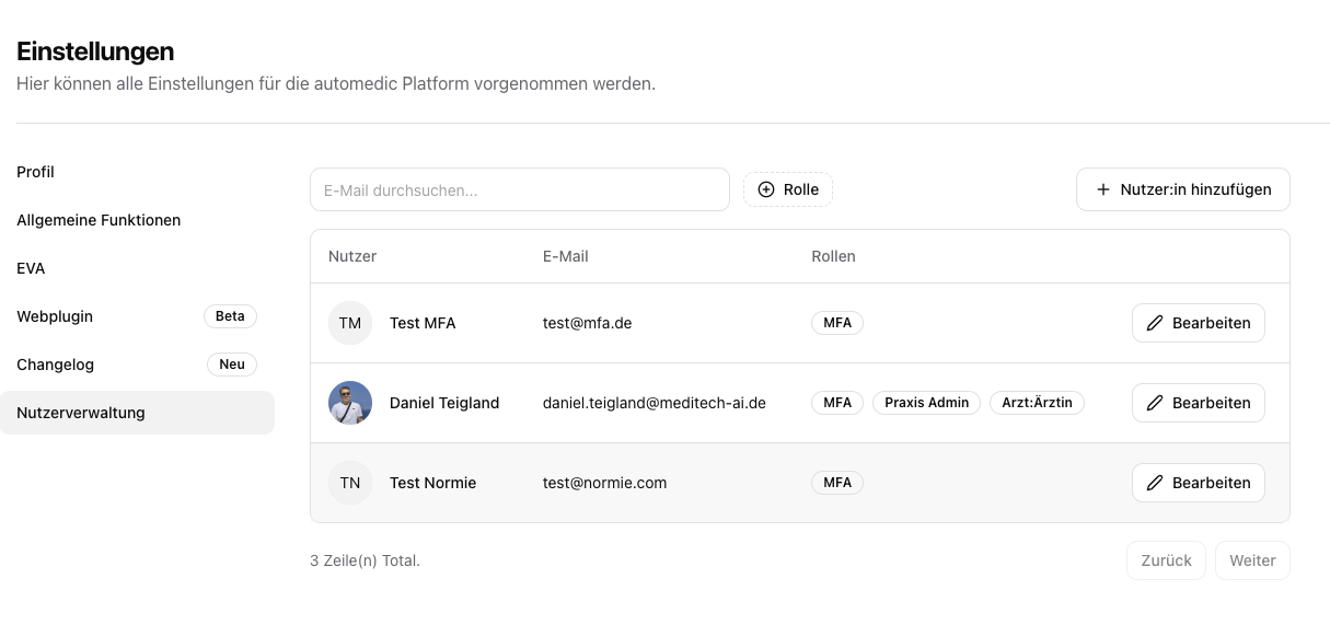 - Das Seitenmenü kann von Praxisadministatoren individuell konfiguriert werden: